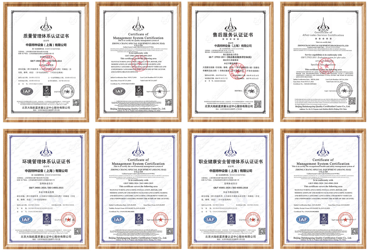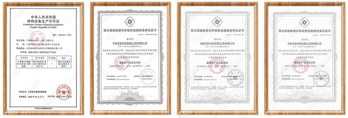 现拥有大型游乐设施制造(含安装、修理、改造)滑行与旋转类A级(含游乐车辆和无动力类)的资质,并取得 景区玻璃类游乐和观景塔设施建造资质(覆盖玻璃观景塔设计、制造(钢结构件)、安装)。获得IS09001质量管 理体系认证,环境管理体系认证,大型游乐设施的安装、修理、改造(含游乐车辆和无动力类)售后服务五星认 证,企业3A信用等级证书等。